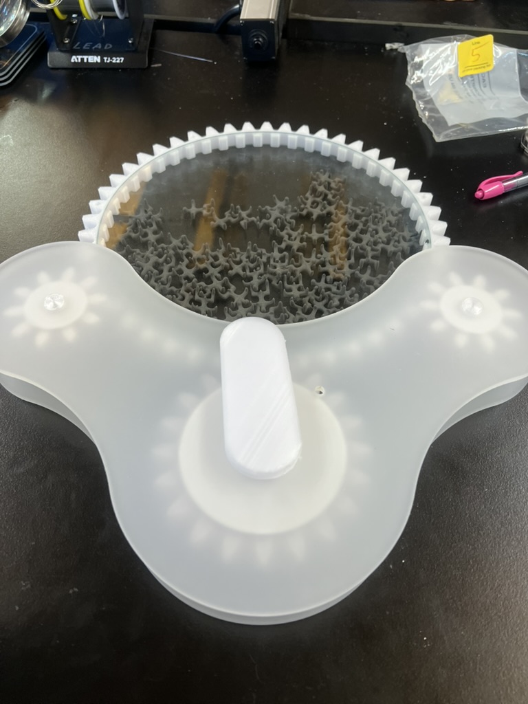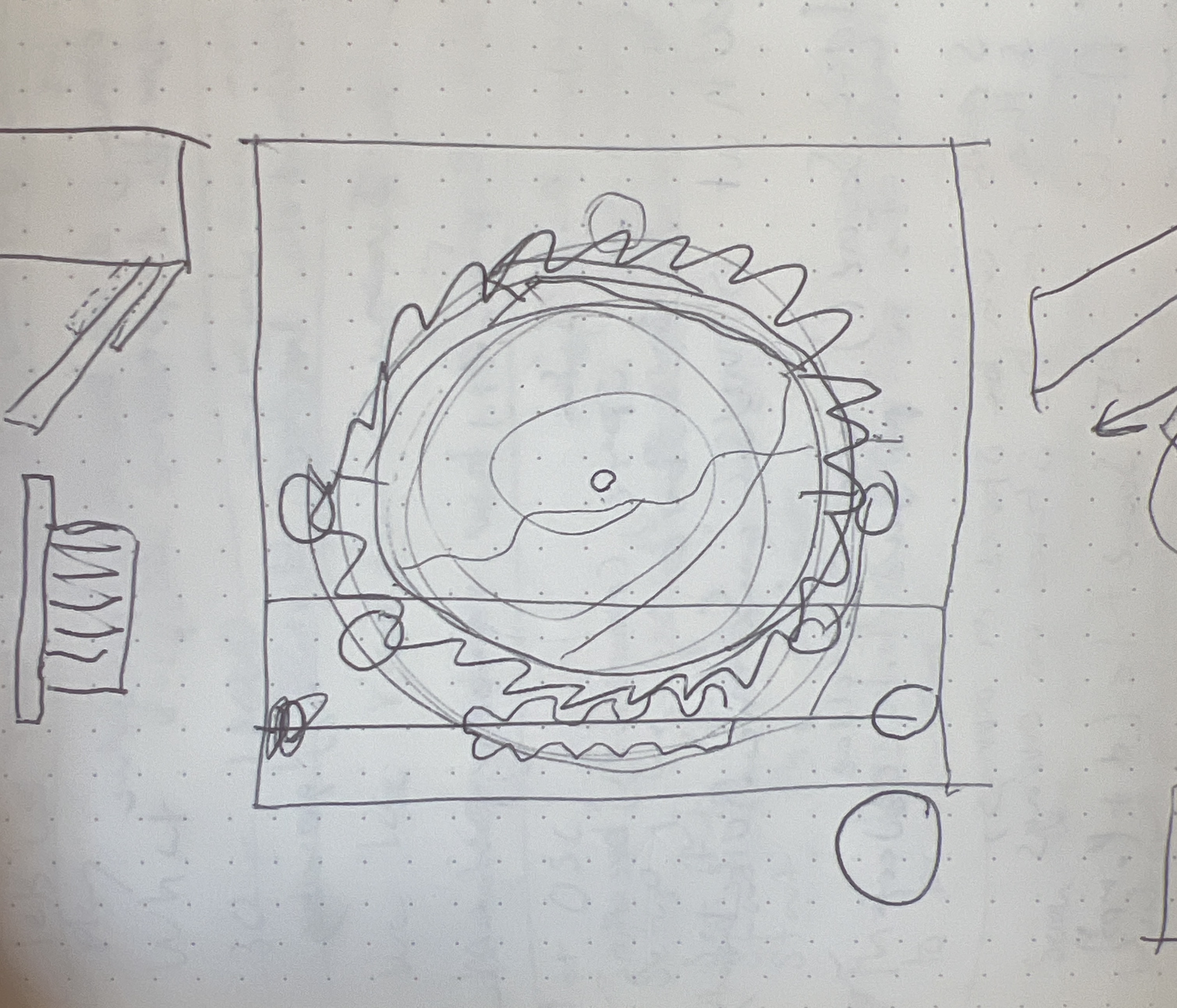 I iterated through a couple ideas on how to get the thing to spin and how exactly it would be an "automaton". I wanted it to spin and recreate itself for a long time, so I needed an energy storage and release mechenism. I also devised three points of contact, hoping to allow me to remove it from the top of the frame.