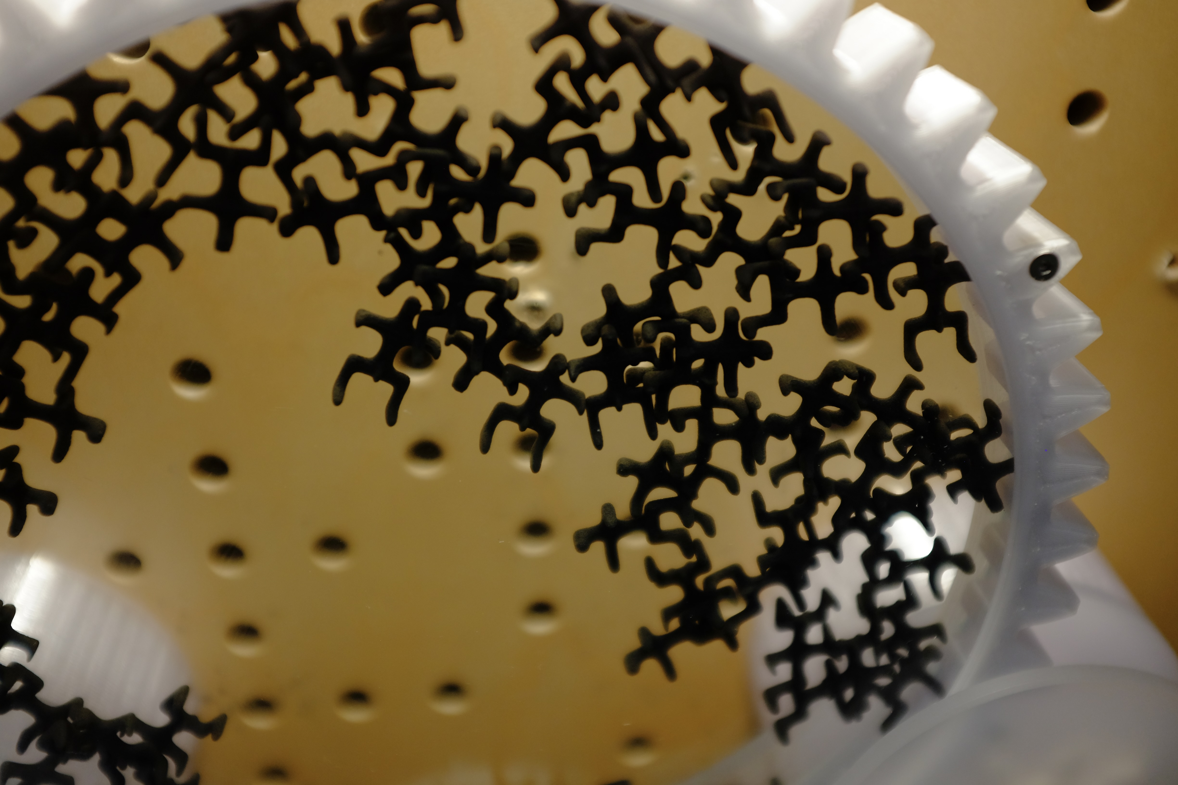 This work is revisiting themes from the previous kinetic randomness generator. Im taking a simple linear (now rotational) input and outputting a complex configuration of figures. I am using the form of a human as my stackable shape because they fit together with some distance. I feel this is how we are as people, random agents in a predetermined system. People tend to get it I think.