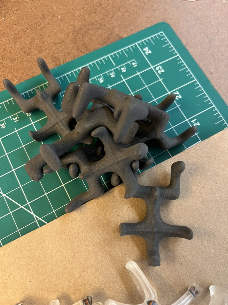 The figurines are leftover from the first KRG development process. I went through many iterations before discovering the imbeded leds as a way to add randomness and control. These prototype figurines were 3D printed on a formlabs Fuse SLS machine using Glass Filled Nylon 12. They feel great in hand and are so strong. I cleaned them all off by hand, back in the day, and kept them. I love them, so I should put them in something. I want to make their uniqueness as an object shine